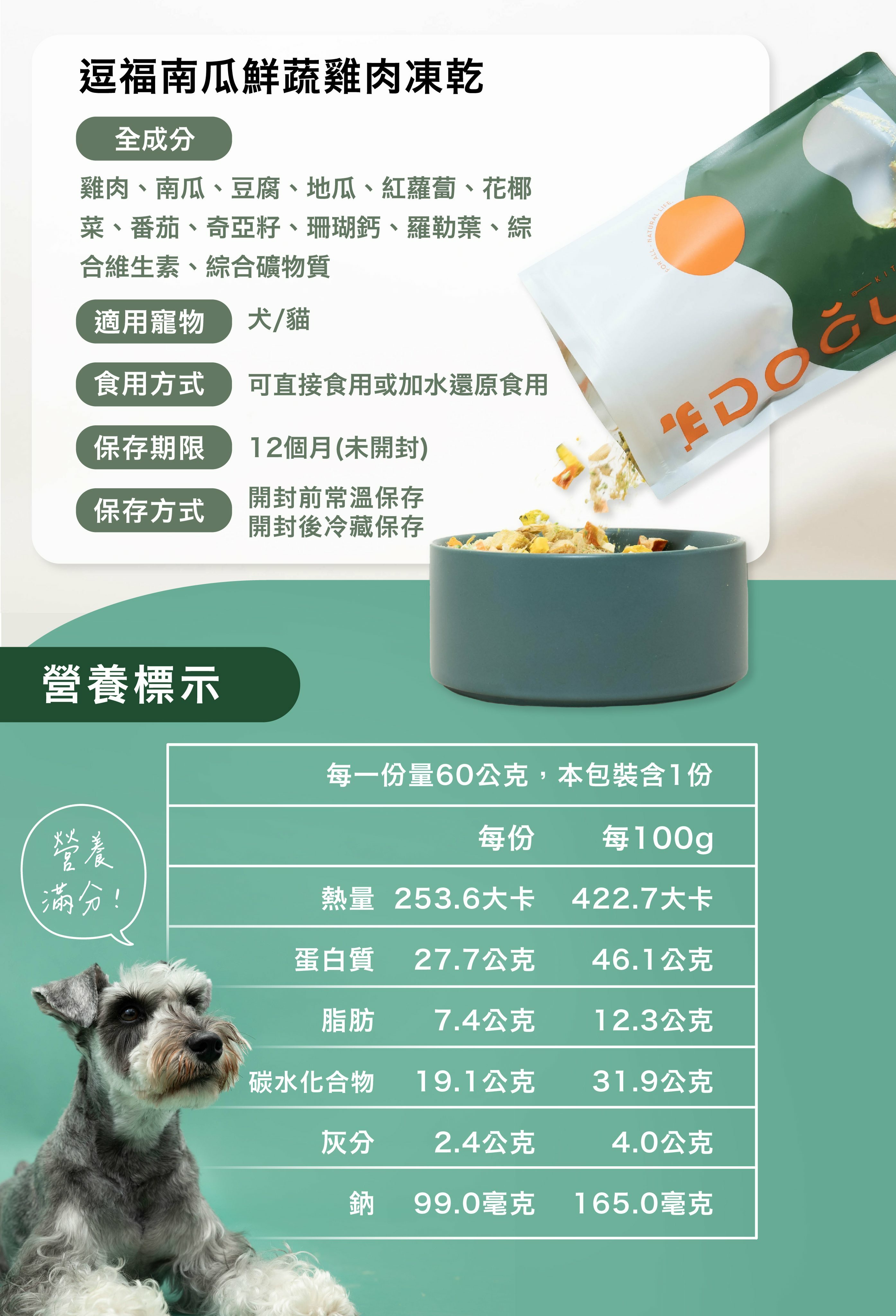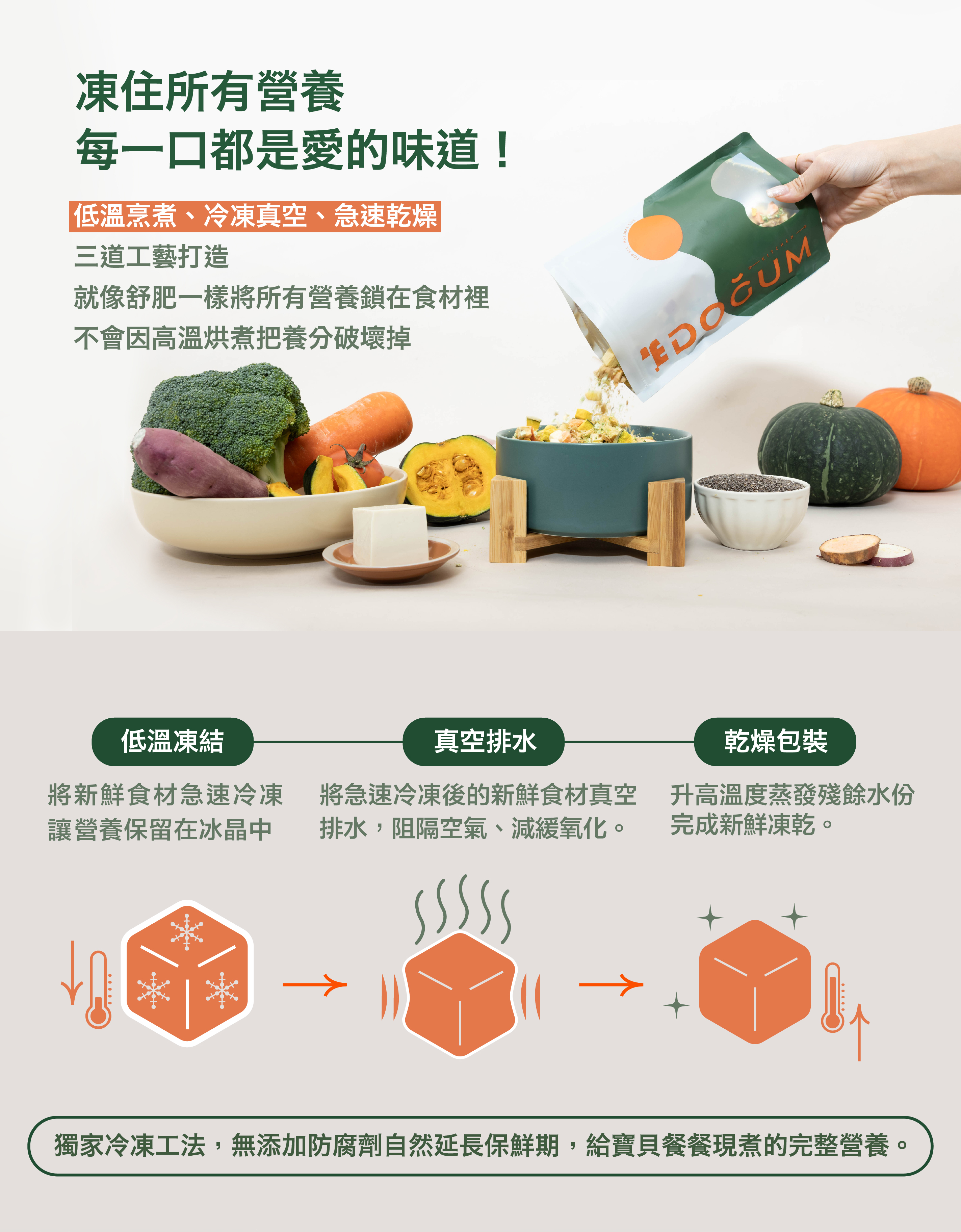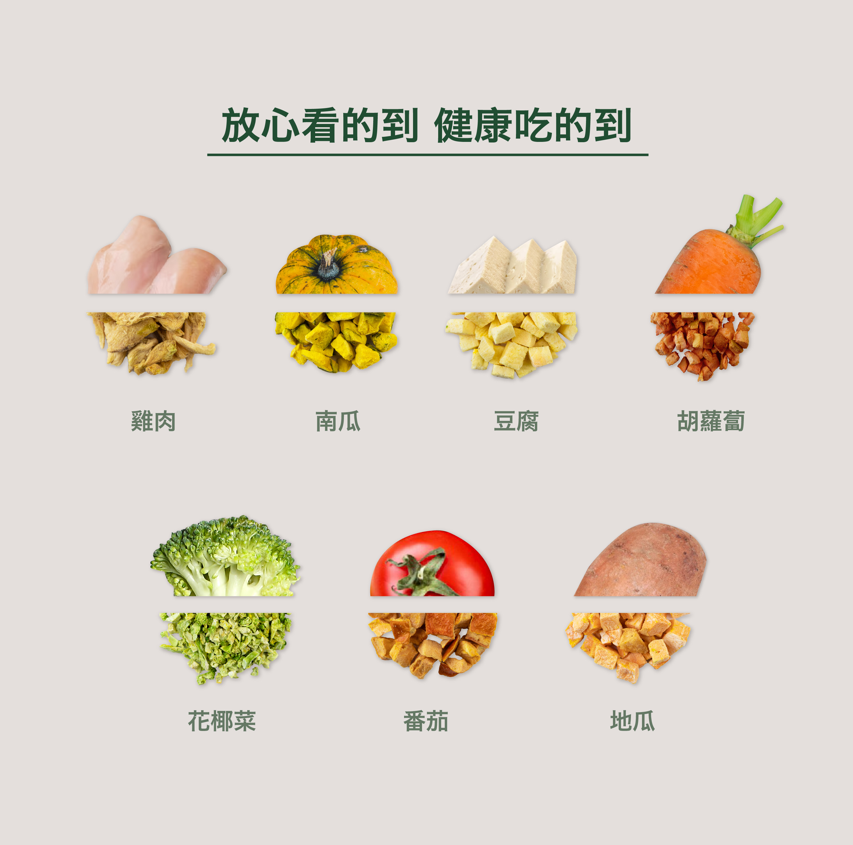 ● 黑羽土雞肉、南瓜、豆腐、胡蘿蔔、花椰菜、番茄、地瓜,完整保留原型食物營養無添加